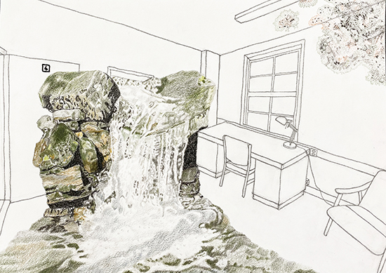 I tested this idea at KHmessen. I took many photos of the surroundings, my room, studio, and other spaces in the building. Then I made several test drawings, ultimately creating a series of four drawings: Rom 23, Rom 4, Rom 18, and Korridor.